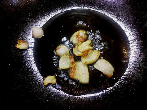 4.炒锅烧热,放入宽油滑锅,油锅烧热之后将其捞出,油再加入半勺食用油。接着将肥肉放在里面,这样肥肉就不会向外溅油了。