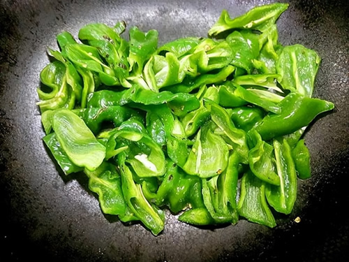 3.炒锅烧热,里面不用放食用油。然后将切好的尖椒块,用中小火将其煸炒出焦香。这样就类似于虎皮尖椒的做法。煸炒出香味,变软之后将其放入盘中备用。