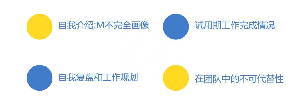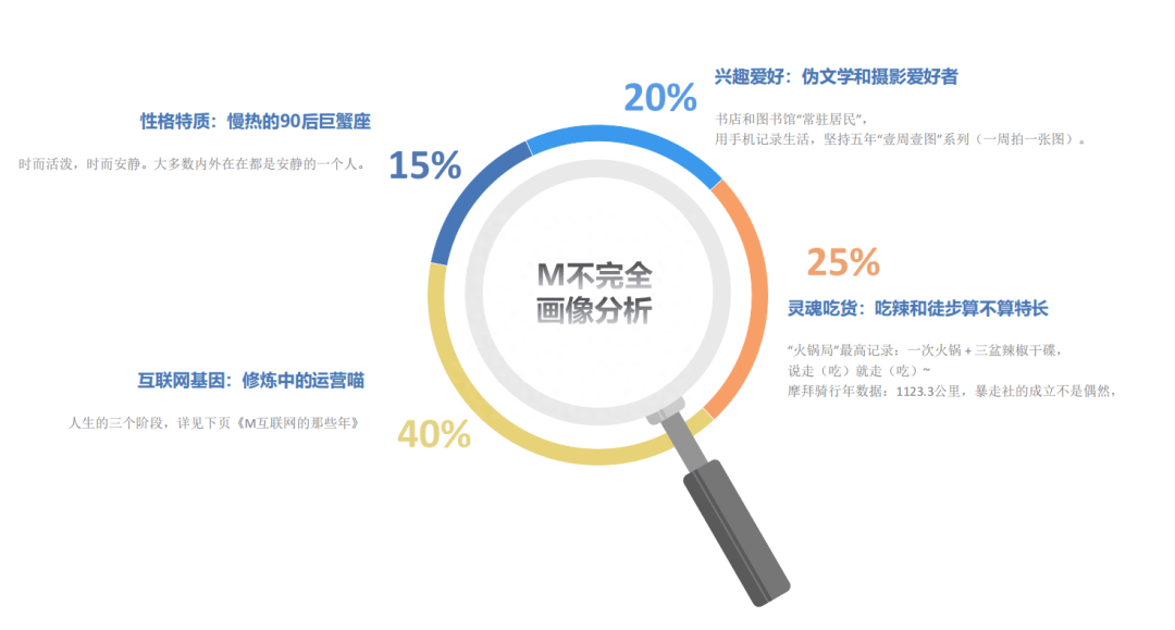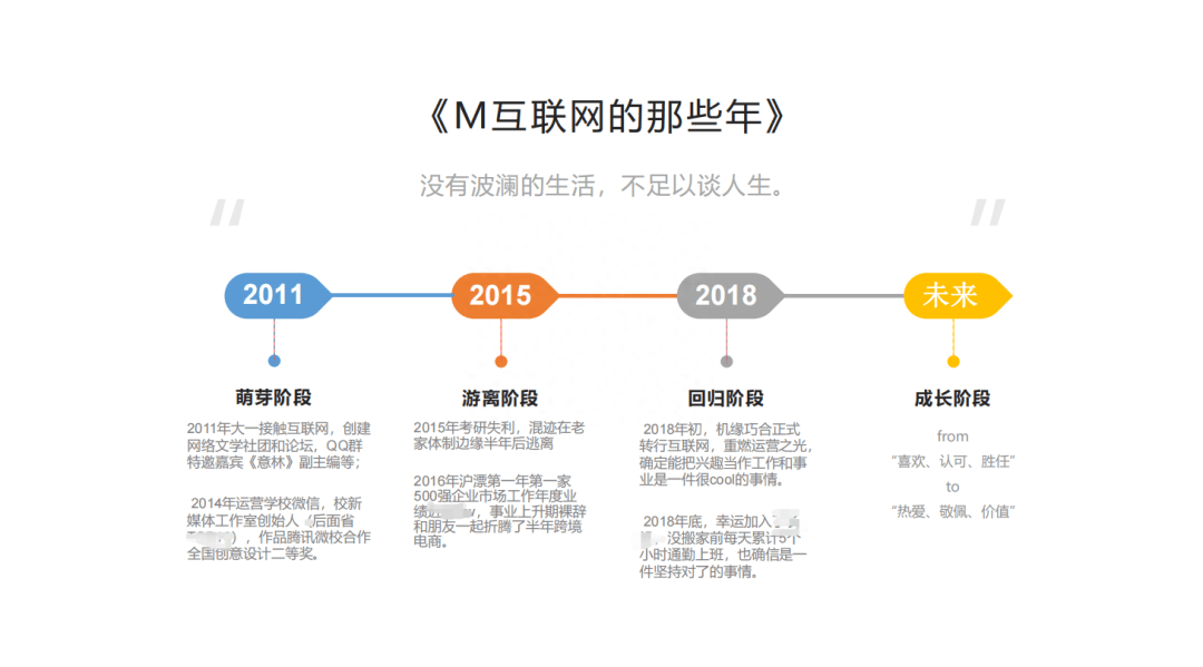 比如自我介绍,我用了用户画像这个标题,内容用了《M不完全画像》和《互联网那些年》小标题。