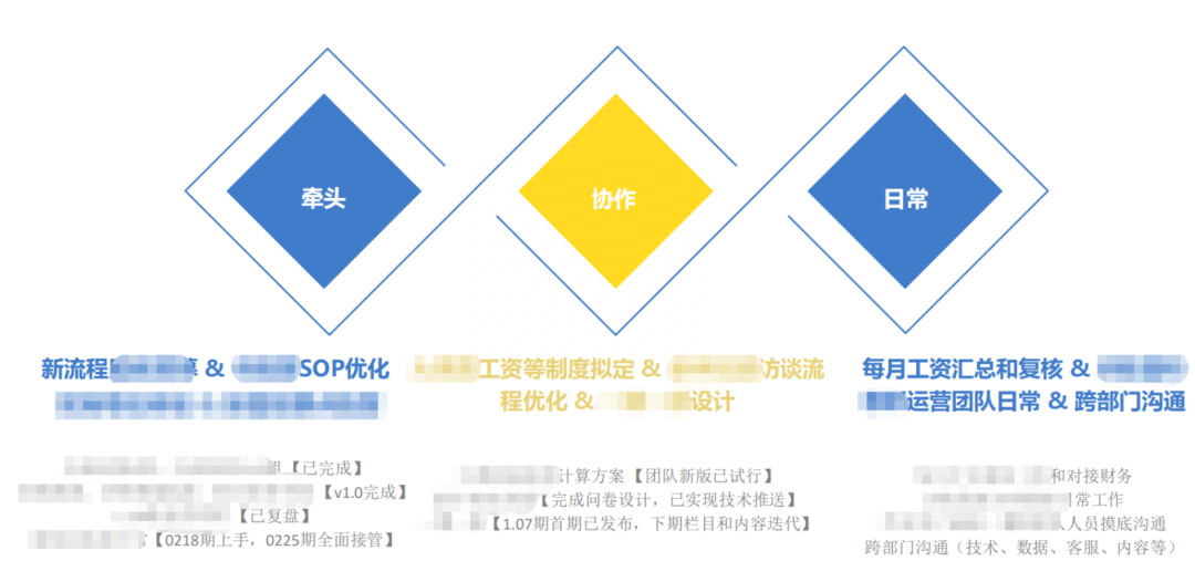 分为三个部分:牵头(独立负责的项目)、协同(和部门同事一起完成的事情)、日常(日常的工作和跨部门沟通)。