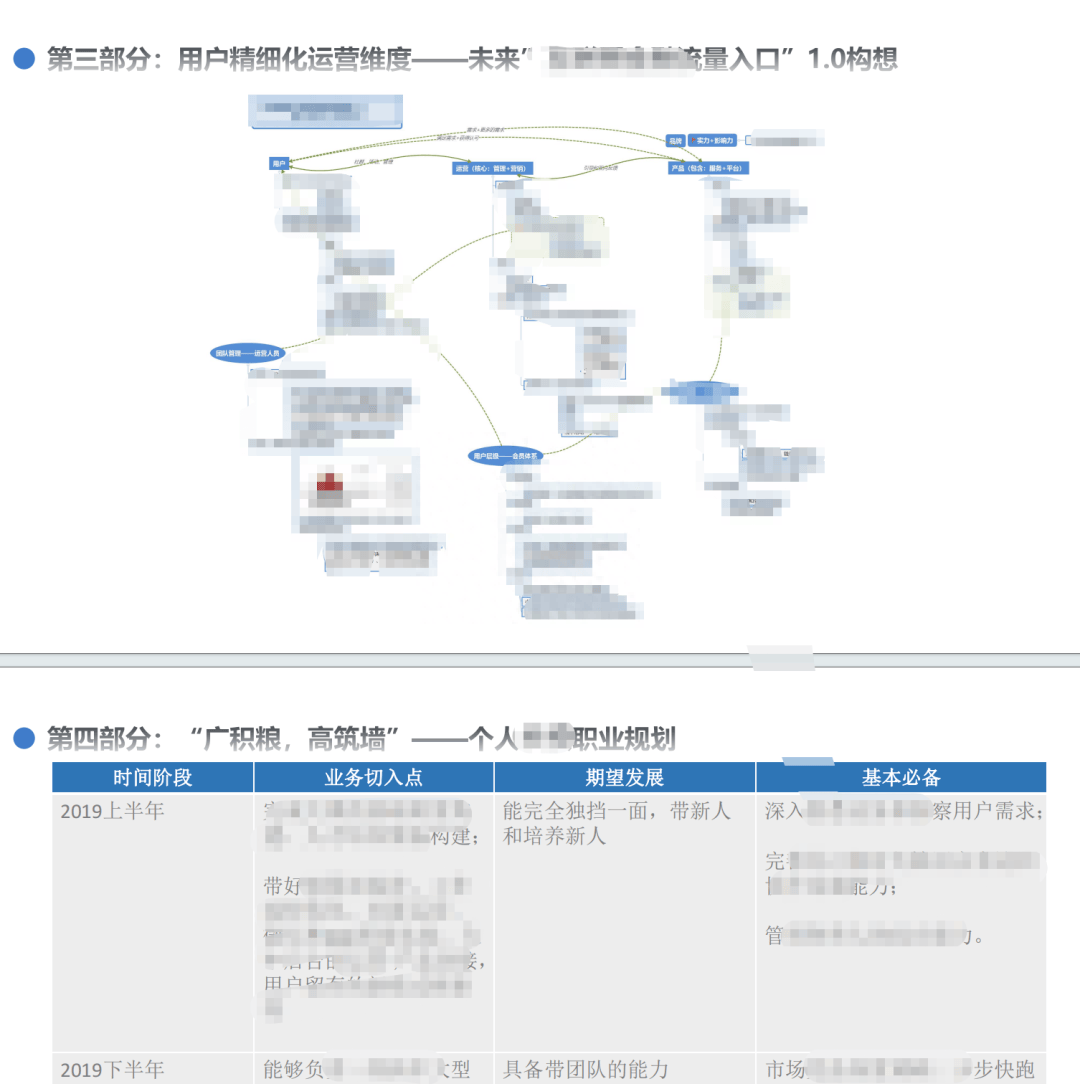 做加法:把自己发散的思维导图粘贴了过去(答辩的时候只是展示了下,并没有展开讲)。做排序:列了自己1年的职场规划,按照半年时间单元格拆解,包含具体业务切入点,目标,当下状态的梳理。