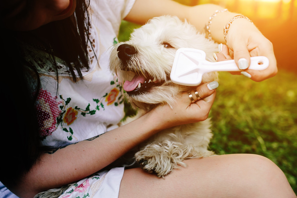 主人给狗狗洗澡前要先梳理一遍狗狗的毛发,有利于把狗狗死毛和粘附在毛发上的脏东西统统梳理掉,让主人接下来的洗澡工作能够洗得更加顺畅、省时间。