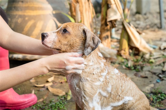 给狗狗梳理好毛发了,然后就用适宜温度的水把狗狗身体打湿,能让狗狗洗澡时毛发更加柔顺一些。注意打湿狗狗身体的时候,不能让狗狗眼睛耳朵接触到热水,免得这些比较敏感部位受到刺激伤害。