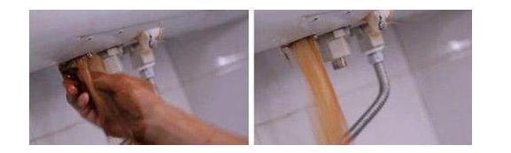 当看到流水没压力时,水开始有点变色时,换了一个桶接。没多久就有污水流出,电热水器中的水放空。直接从排污口用注射器向内倒了清洁液,且把排污口重新堵上,出水口堵上,接好进水管,又加了约3分之二桶水。且加水过程是时满水,时小水。约30分钟后再打开排污口把水放掉,且反复加清水冲了热水器3次。