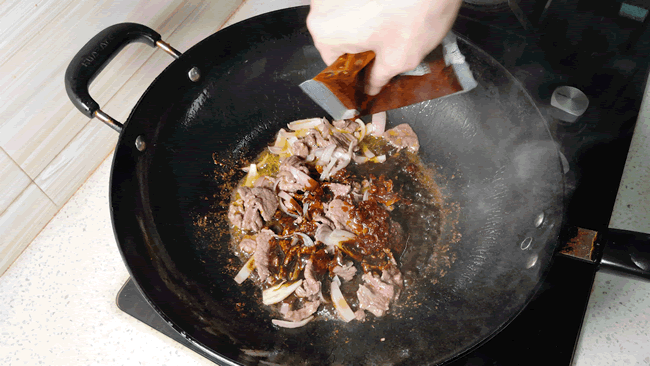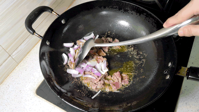 5、热锅冷油,放入牛肉,翻炒至变色,接着放入洋葱,爆香,炒出香味。