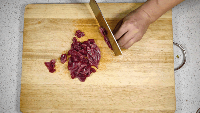 4、在切一些自己喜欢吃的鸡肉、牛肉、羊肉、猪肉等。自己在家里做炒米粉,当然肉要多放一些。