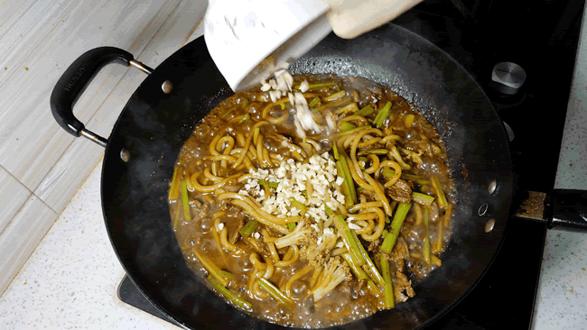 9、米粉中汤汁快要收干时,放入一些蒜末,来增加蒜香味,如果不喜欢吃大蒜的朋友,可以不放。