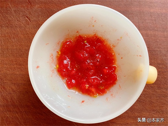 小番茄表面划十字口,放进开水里,一分钟后取出去皮,用勺子捣成碎丁即可。