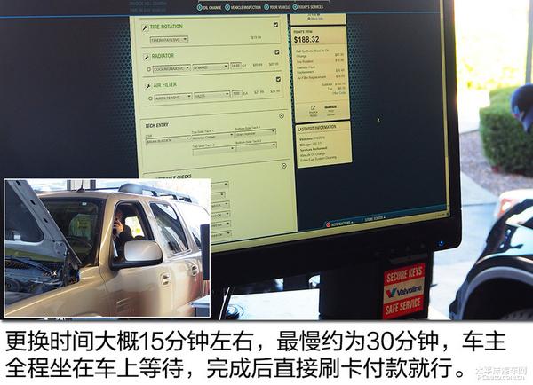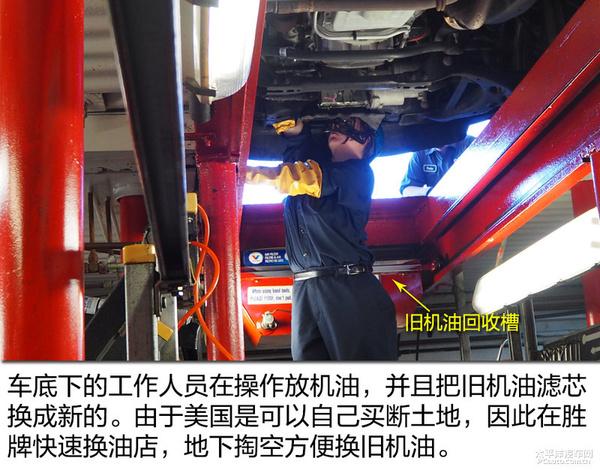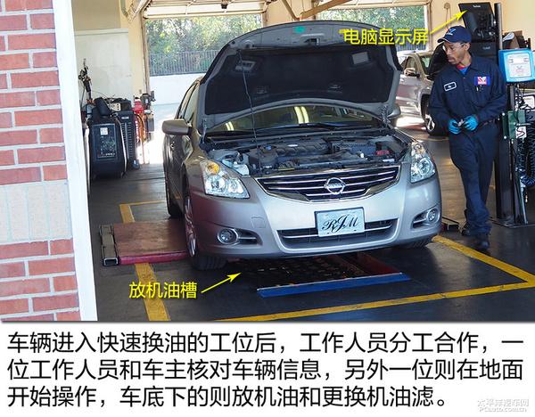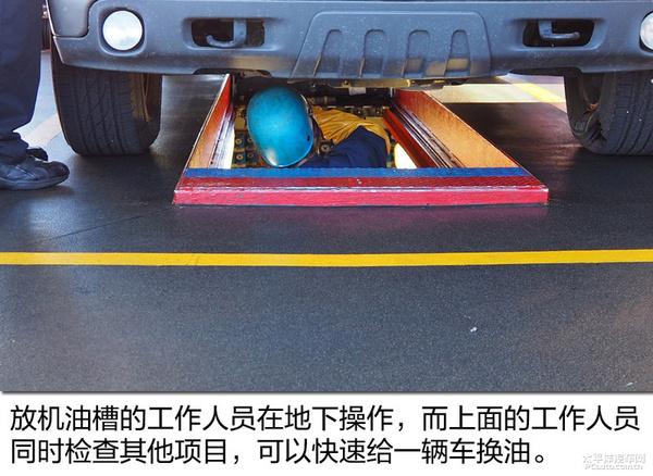 在胜牌快速换油中心,车主将车开到指定车站,三名工作人员立即为车辆提供换油服务。换油中心的底部是空的。一名工作人员在车下操作放油和更换新的机油滤清器滤芯;另外两名工作人员与地面车主沟通更换机油,并完成新机油的添加。整个过程最快只需15分钟,最慢只需30分钟,雨刮器、空气过滤器和空调过滤器也可以更换。车主只需坐在车里等待机油更换,不需要下车。