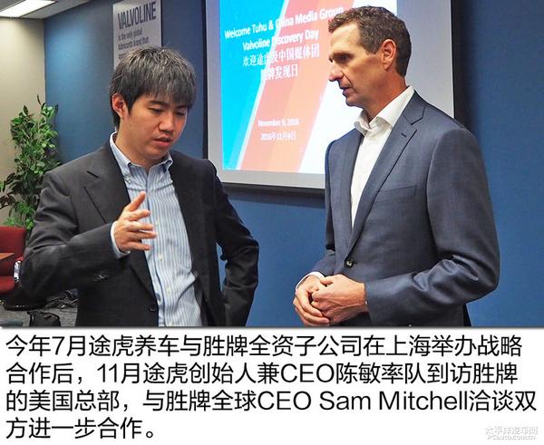 2016年7月18日,途虎养车与胜牌全资子公司胜牌中国在上海举行战略联盟新闻发布会。会上,途虎宣布获得胜牌机油正品授权,成为其汽油及维修产品B2C渠道战略伙伴。不仅如此,6月18日,胜牌150周年汽车发动机润滑油也选择在途虎汽车平台上在中国推出。这一系列合作不仅将充分发挥胜牌产品和途虎汽车的优势O2O该领域的优势也为建立企业互信、进一步深化合作奠定了良好的基础。11月,途虎创始人兼CEO陈敏带领团队到美国总部进一步合作。