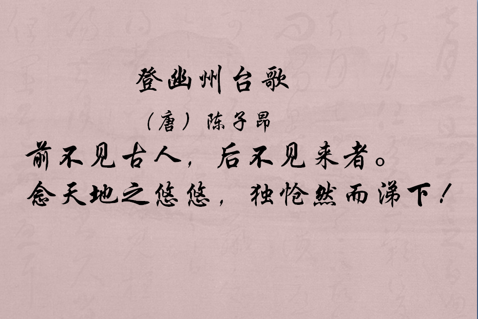 我们看一下陈子昂诗歌题目里说的那五个字“登幽州台歌”,最重要的是三个字“幽州台”;再看全诗主体内容,最重要的是四个字“怆然”“涕下”。我们用压缩的方法保留了全诗最重要的两个内容,一是幽州台,二是伤感流泪。前面我们提过,这首诗有一半的内涵都是通过题目“幽州台”来表达的,如果不读题目或者忽视了题目,这首诗歌无论是意蕴还是意境都会毁损殆尽。假使我们抛弃了题目直接品读诗歌内容的话,或者说这首诗换一个《无题》的话,那么这首诗还能不能流传下来就很难说了。下面我们就来谈一下“登幽州台歌”这几个字到底厉害在哪里!