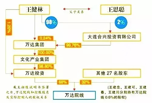 新闻报道中是这样说的“ 根据招股书,大连合兴投资有限公司直接持有万达集团99.76%的全部已发行股本,而王健林持有大连合兴98%的股权,剩余的2%由王思聪持有。
