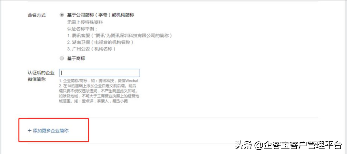 添加多个企业简称也必须通过企业微信认证来完成,所以先要进入认证页面,点击下方的“添加更多企业简称”即可,这样就可以拥有多个简称了。