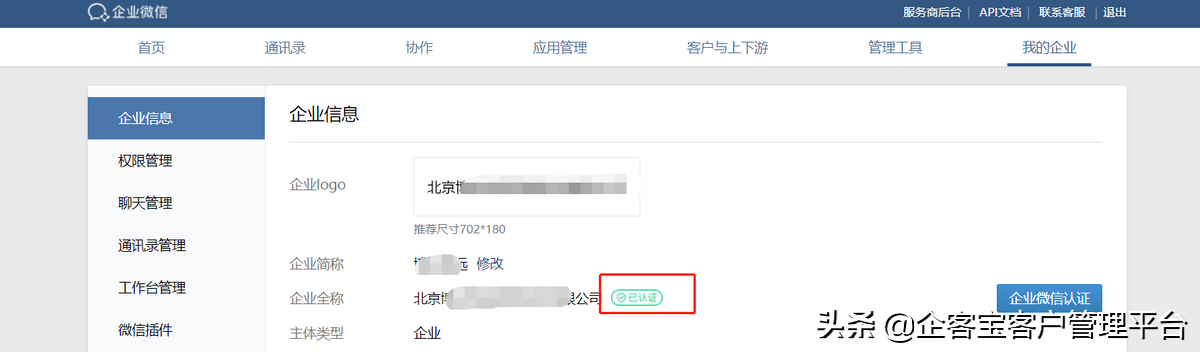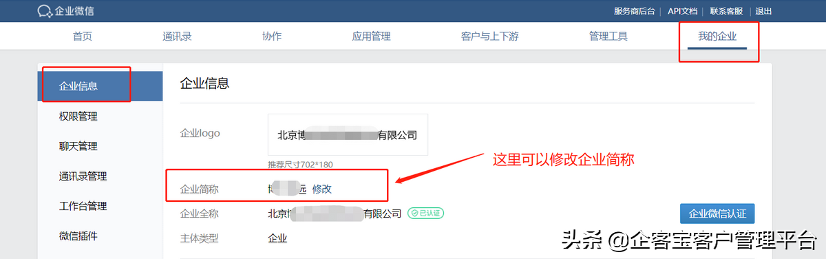 需要注意的是,如果企业带有“已认证”标识,表示企业已经进行过企业主体认证,需要在重新认证企业主体后,才可以更改“企业简称”。