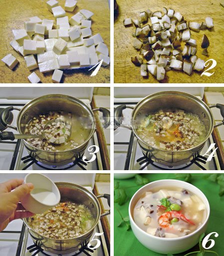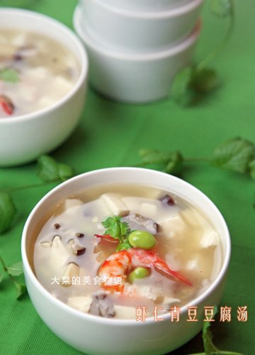 鲜虾10只、青豆50克、豆腐(最好用南豆腐)一盒350克、香菇3朵、高汤适量、淀粉2汤匙(30ml)、盐适量