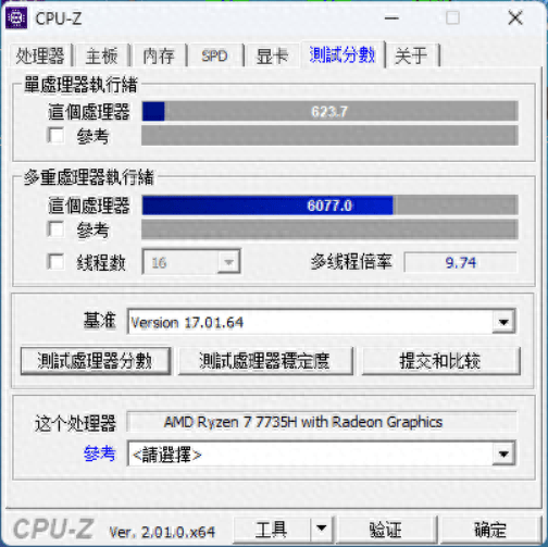 通过CPU-Z测试可以看到,这颗处理器的单核成绩为623.7分,多核成绩为6077.0分,就移动级标压处理器而言,其性能表现还是相当不错的。