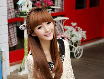 披肩的长发直发,非常的柔顺甜美,加顶端的一股编发点缀,呈现浪漫淑女味道,内扣的齐刘海打造童颜小脸。浅棕色染发非常的时尚养眼!