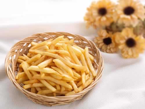 6.将凉干水份的薯条加少许的玉米淀粉拌一下防粘。