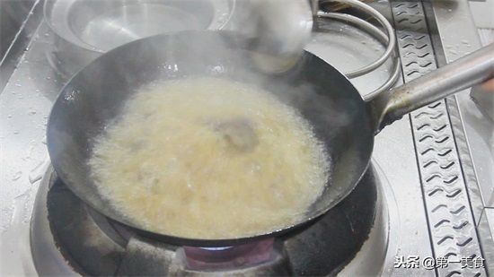 锅内倒油,油烧至微微冒烟,把鸭胗倒入油锅,炸5秒钟就马上出锅。短时间过油,鸭胗口感比较脆,太久就会疲软。