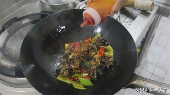 加入食盐,鸡精,胡椒粉,白糖,加入一点清水,翻炒化开调料。勾入水淀粉,翻炒收汁。关火后,淋入红油,翻几下,出锅装盘。