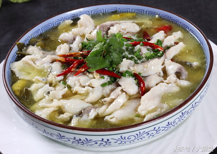 4.酸菜鱼汤制作:水1100克,猪骨浓汤12克,酱椒50克,盐4克,鸡味精10克,小米辣10克。