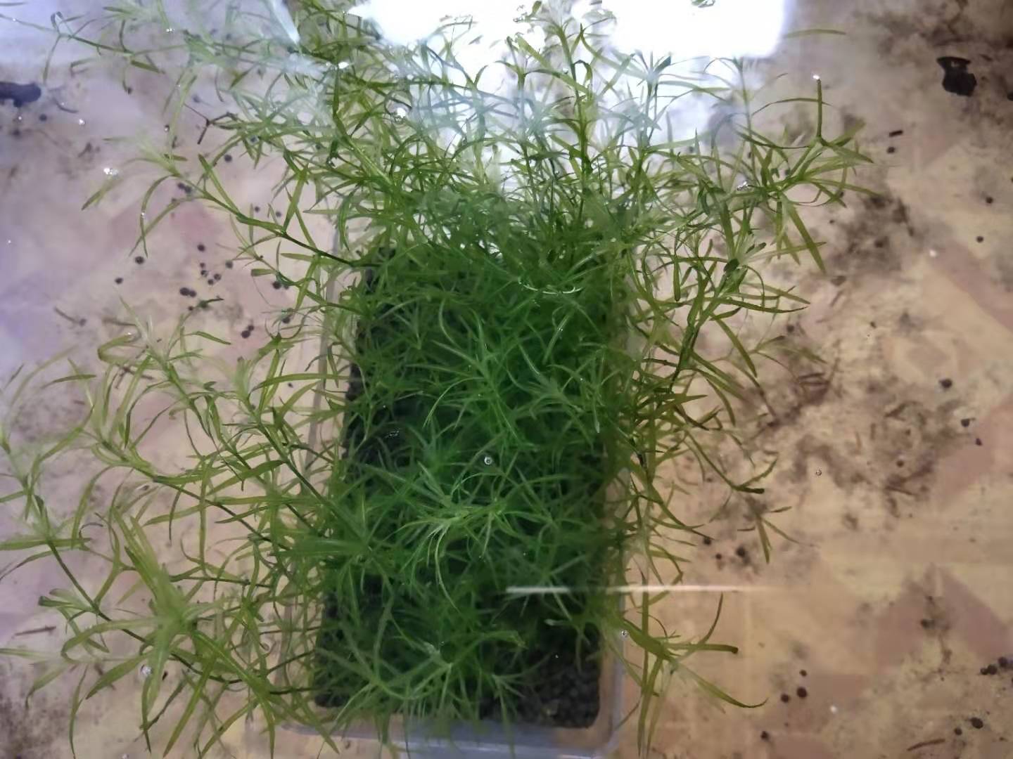 挨个检查完毕,确认无误后,我们就可以找一个小陶瓷缸或者广口、水位不高的容器,提前放置一定的水草即可,水草一定不要是漂浮在水面的,至少要在水位的中部偏下一点为好,什么水草都是可以的,不要宽叶水草,比如水榕、皇冠草之类的。