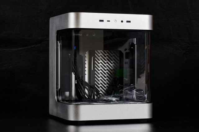 机箱的最大亮点,就在于这个犹如全景落地窗般的双曲面侧透玻璃,而且是一体成型,相当具有视觉冲击力,无论从哪个角度看,机箱内的硬件都是尽收眼底,。辅以机箱的阳极氧化铝外壳,可以说,斜杠青年的造型更趋于极简风格,面向不同风格的桌面更加百搭。