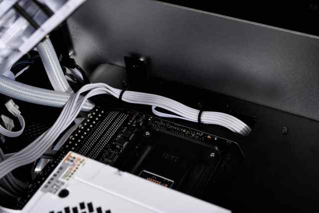 主板背面的走线,建议大家用扎带处理一下,毕竟水冷风扇就在那位置上,线太多而乱,会卡住风扇,而且也会影响冷排的散热效能。