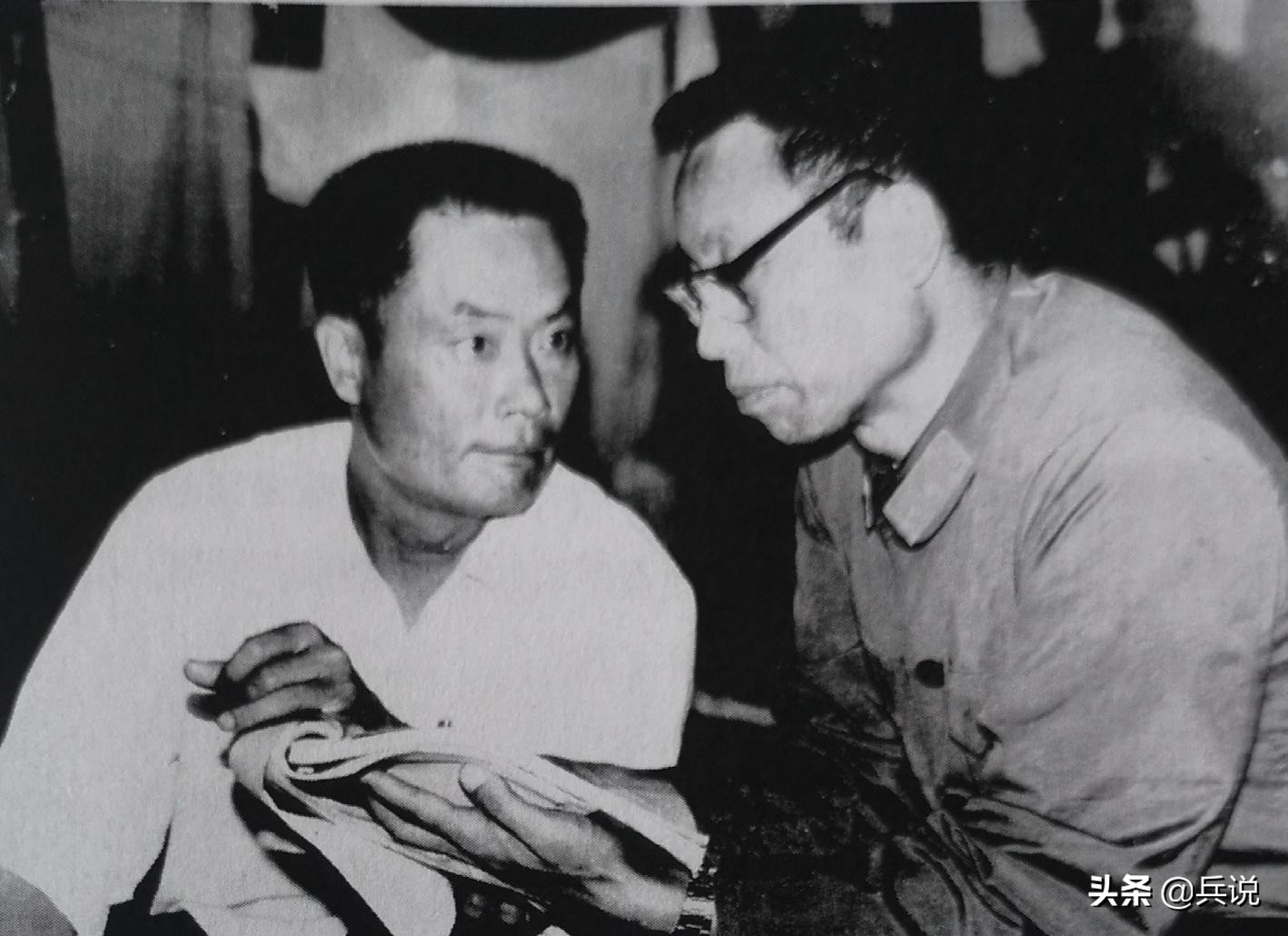 32师师长刘玉尊(右)、政委刘先诚(左)在研究作战