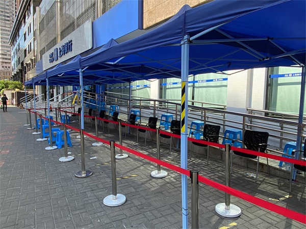 6月18日,上海银行在门外的排队等候区搭起帐篷、安放座椅。