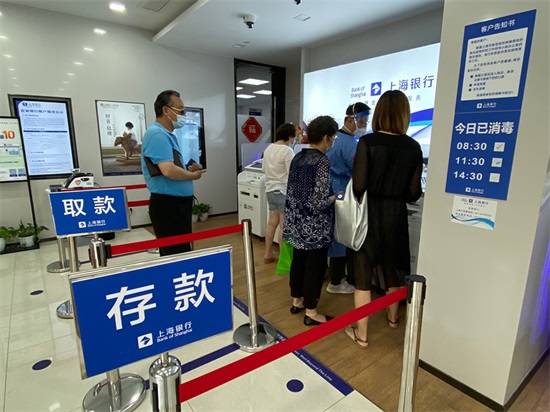 上海银保监局发出通知后,这家银行再次作调整,取消了每天放号的数量限制,只要扫“场所码”显示核酸报告在72小时有效期内,并且体温正常,都可以随到随入,从在银行外等候变为在银行内等候。