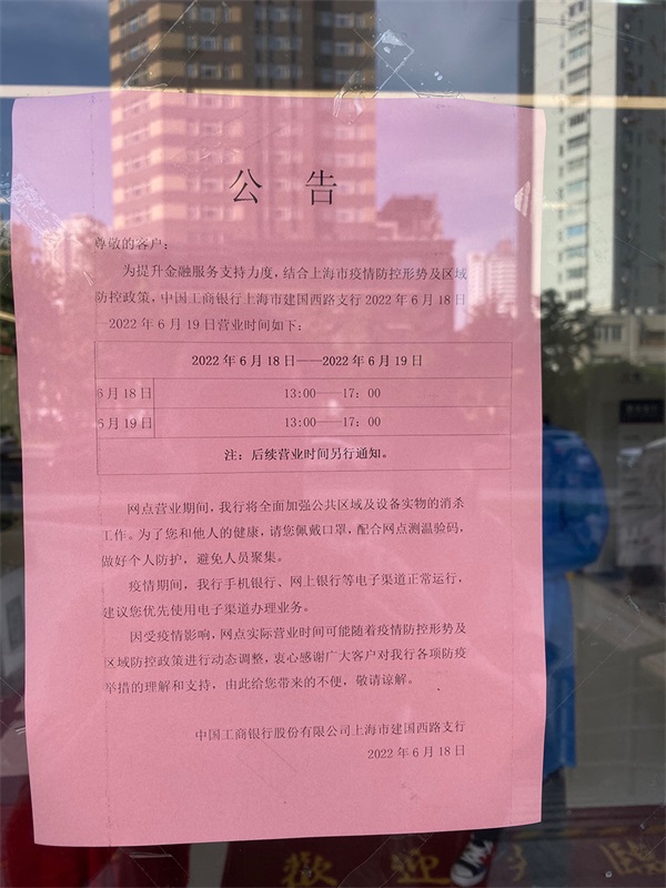 随后,记者来到了肇嘉浜路258号的工商银行建国西路支行,银行门口的台阶处贴着告客户书,上面写着:“尊敬的客户,应防疫要求,排队客户需持有72小时内核酸检测阴性报告或者24小时内核酸采样证明方可入内”,6月6日-10日营业时间为上午9:00-11:30,下午13:30-16:00。