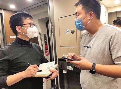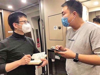 1月29日,章正在开往武汉的高铁上采访中央广播电视总台记者苏洲。 光明日报记者 晋浩天摄/光明图片