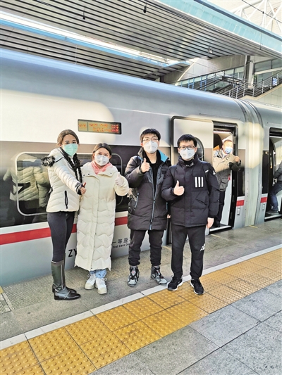 1月29日,武汉一线报道组成员在北京西站同捐赠物资的爱心人士(左一)合影。武汉一线报道组供图