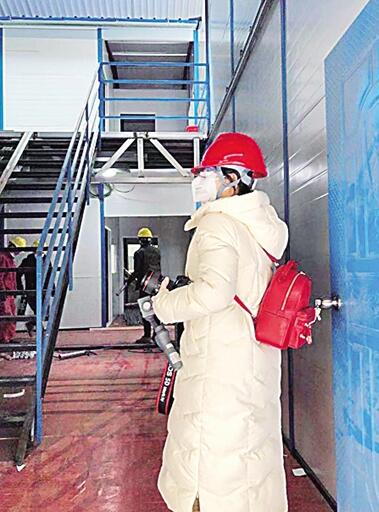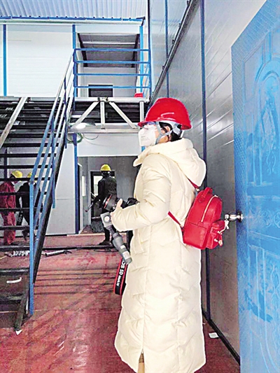 2月1日,卢璐在雷神山医院建设现场采访。光明日报记者 晋浩天摄/光明图片