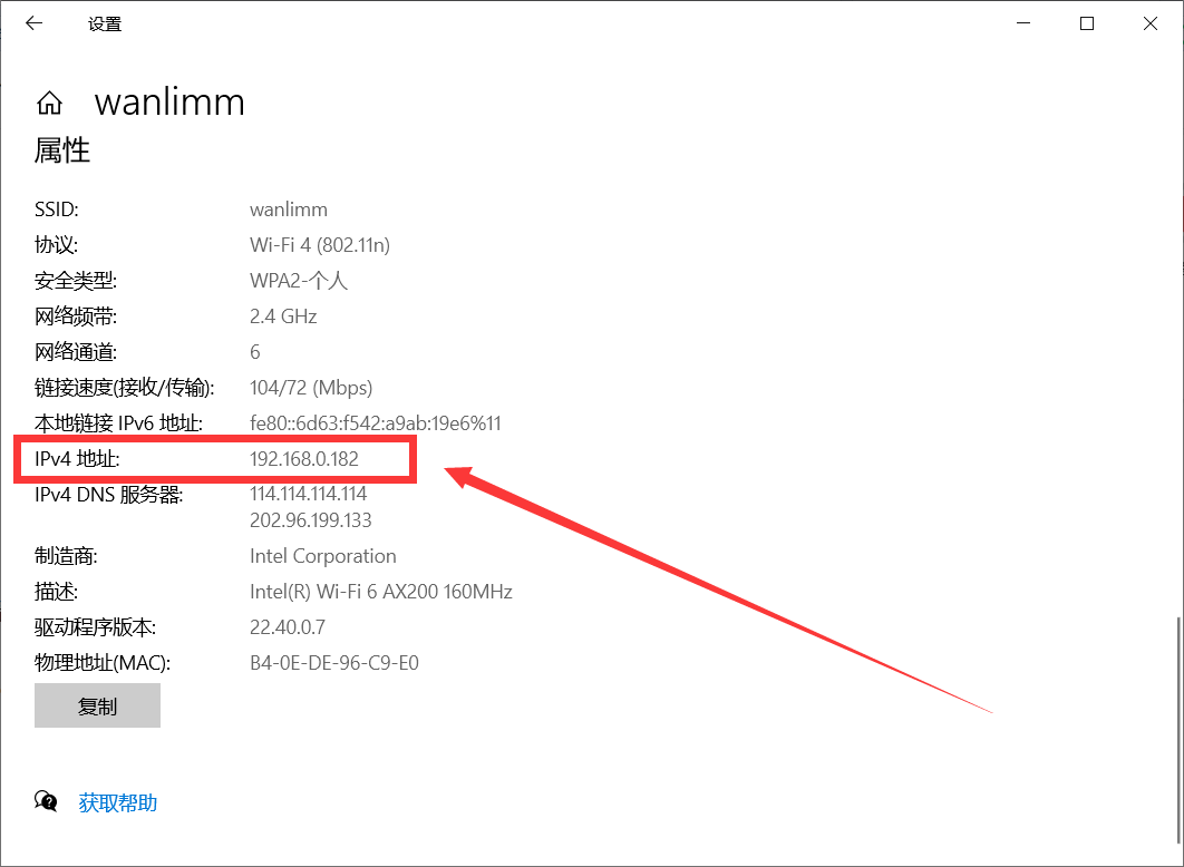 滚动鼠标的滚轮向下拉动,这时,就会显示网络“属性”,这里有一个IPv4,它后面的数字就是这个电脑的IP地址(如下图标红处),这个IP地址,在第三步中会用到。