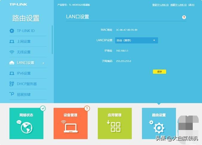之后,点击左侧“LAN口设置”,一般会选择“自动”设置,让系统自动分配 IP地址。