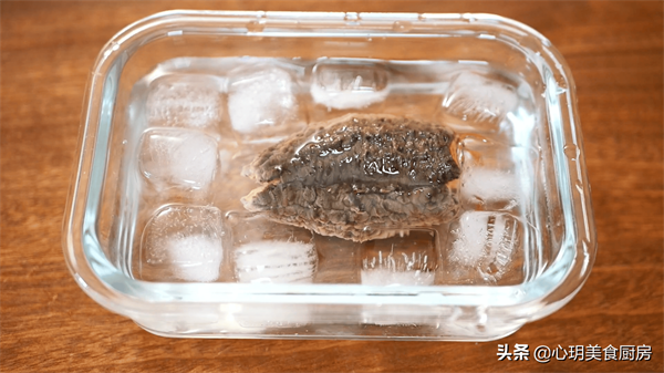 如果你想吃到海参原汁原味的口感,就往玻璃容器里面放入一些冰块,接着打开海参的肚子,清理干净,倒入纯净水,再将冷却下来的海参放入。