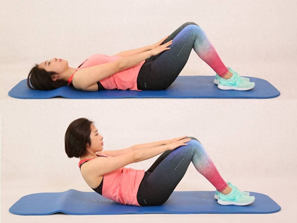 卷腹不等于仰卧起坐,卷腹只需要降身体抬至与地面成约45度就可以了,手掌摸着膝盖即可,