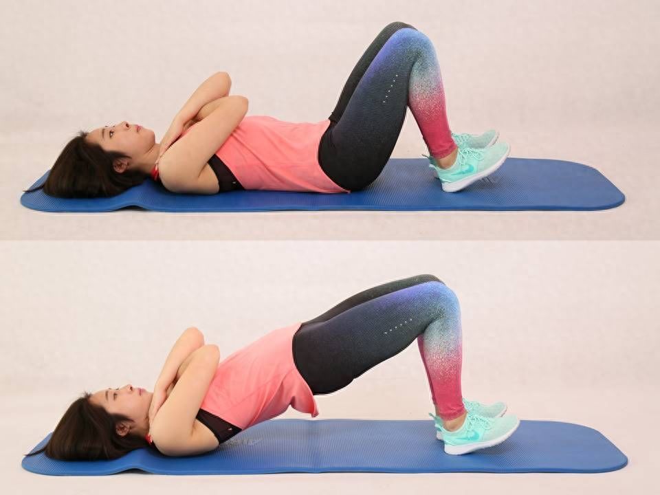 臀部上抬至肩髋膝成一条直线。此时能充分感受到臀部及大腿后群肌肉的用力。每组16个,重复 3-4组。注意放下时慢放,同时臀部不要完全贴于地面。