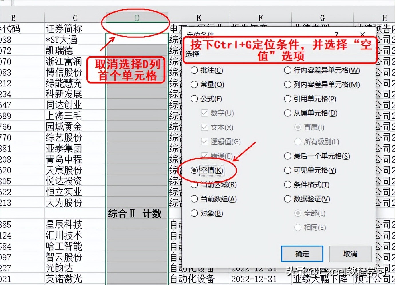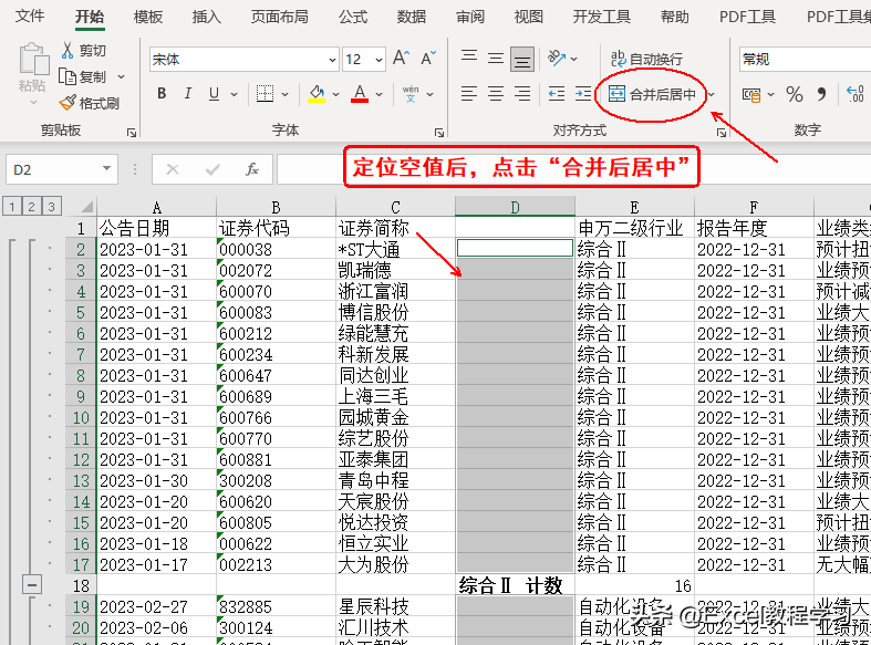 定位空值的目的是将D列中所有空单元格选定,以便后续将这些连续的空单元格进行合并操作。