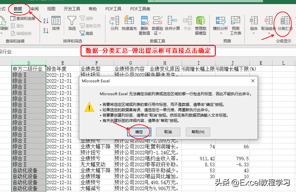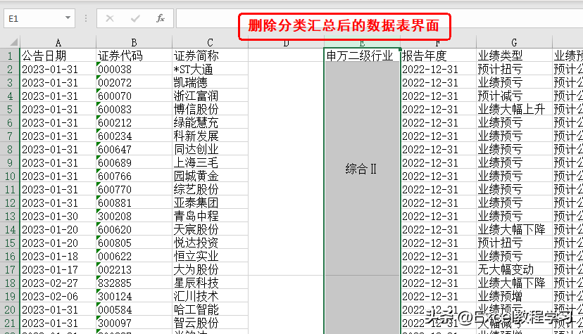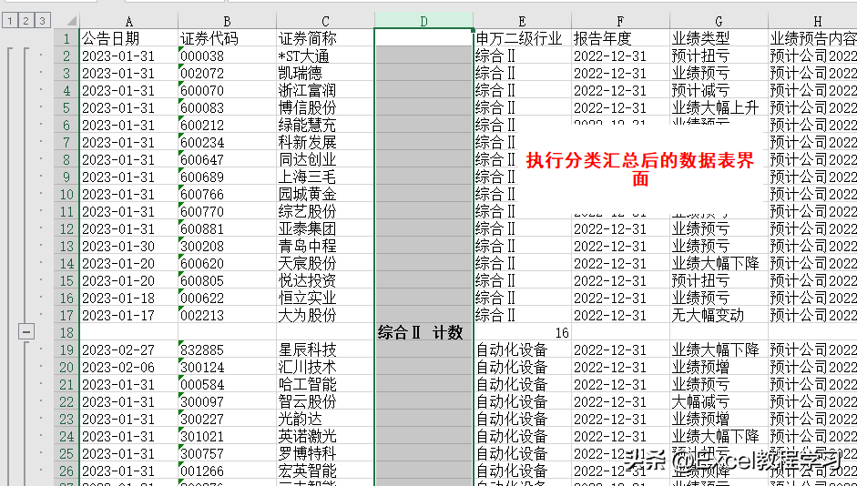 到这一步,基本达成了相同项的合并效果,但数据表还包含了D列字段列和各组行业的汇总行,接下来就是删除这些不需要的数据。