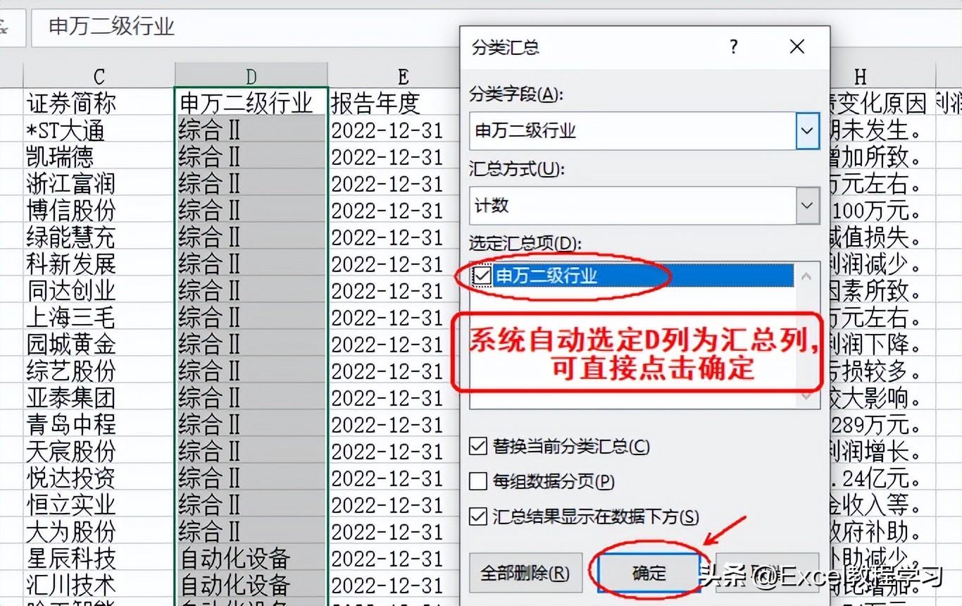 之前选择了D列来执行分类汇总,则系统会自动选定该列作为汇总列