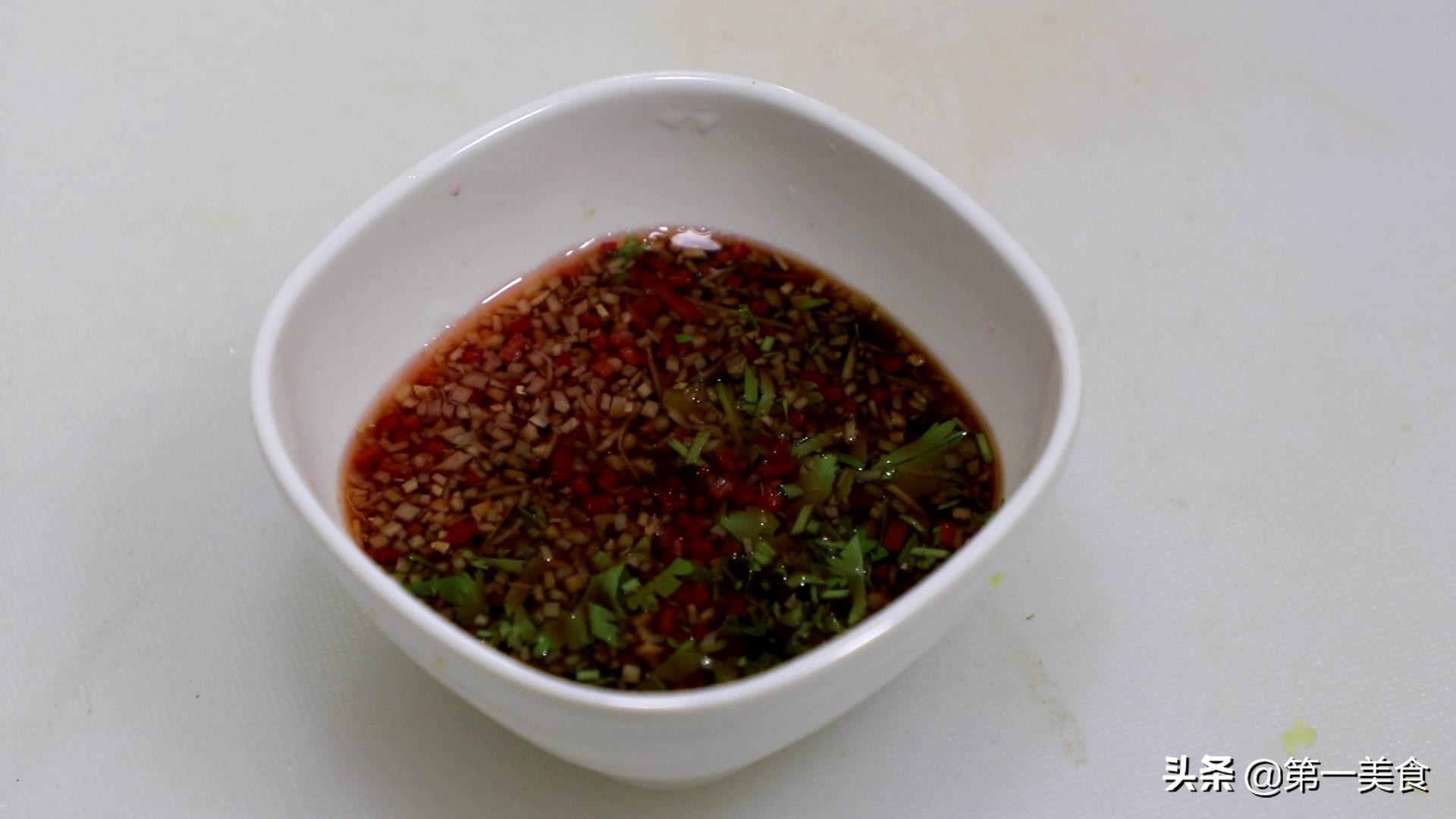 第二步:蒸虾的时间,就是准备我们清蒸大虾的灵魂蘸料汁了,每一盘成功的清蒸大虾,背后一定有盘调制丰富层次鲜明的蘸料汁,只需生姜一块,切成姜末,放入碗中,香菜少许切碎,红椒一片,切成小粒,加入大红浙醋10克,生抽20克,陈醋10克,食盐2克,白糖少许提鲜,搅拌均匀备用;