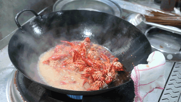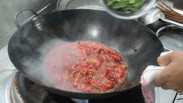 9.煮沸以后,倒入小龙虾,加入味极鲜10克,白糖2克提鲜,胡椒粉1克,搅拌化开调料,加入辣鲜露3克,改小火盖上锅盖,煨5分钟,使小龙虾慢慢入味。
