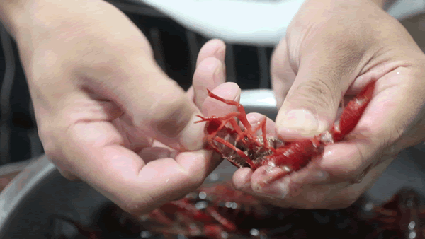 1.准备新鲜的小龙虾二斤左右,放入盆中,倒入清水,用手拉住小龙虾的尾部,扭动两下,去掉虾线。