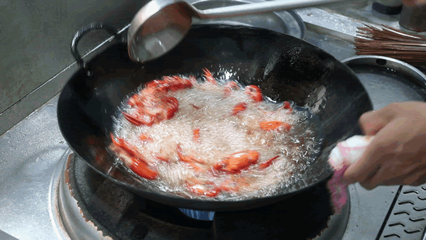 4.起锅倒入食用油,等油温至五成热时,先把小龙虾倒入漏勺中控去水分,再下入油锅中,用勺子连续翻动,使小龙虾受热均匀。