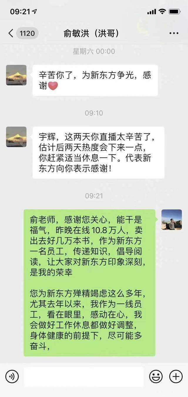 俞敏洪发微信关心得力下属,虽然文字很简单,但透露出一种真情实感,对董宇辉是真关心、真关爱、真心疼,字里行间是流露出真诚,很容易感染人。所以,董宇辉也是真被感动了,回了一段微信,有力地承接了领导的关心和问候。