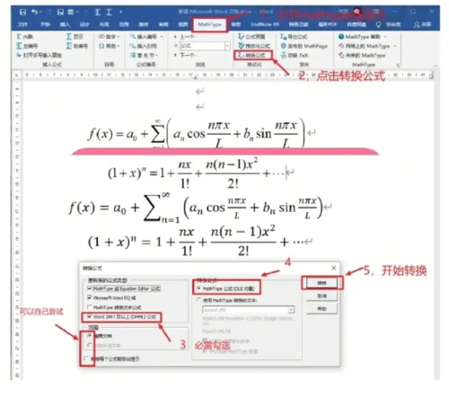 在文档中输入两个公式,看一下两个格式的对比,接着选中需要转换的公式,点击mathtype这一栏,然后点击转换公式,在跳出来的页面中选择勾选Word2007及以上,然后点击转换就可以啦