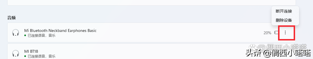 5、点击要断开的蓝牙耳机设备名称最后面的三个点,会弹出断开和删除设备2个选项。如果选择删除设备,下次需要重新连接配对蓝牙设备再连接耳机,我们点击第一项,选择断开设备,如下图所示: